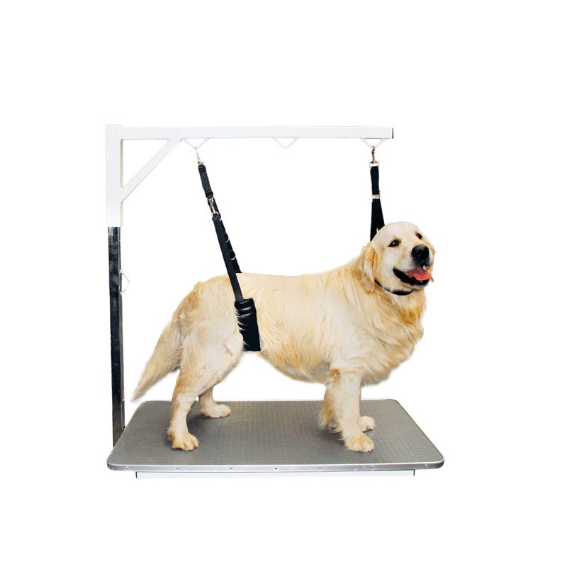 Lannevyö on loistava ja kivuton apu pitämään trimmattava koira seisomassa tarvittavan ajan. Sen paksu pehmustettu osa ei paina koiran mahaan tai nivusiin, joten sen käyttäminen on mieluisaa myös koiralle.